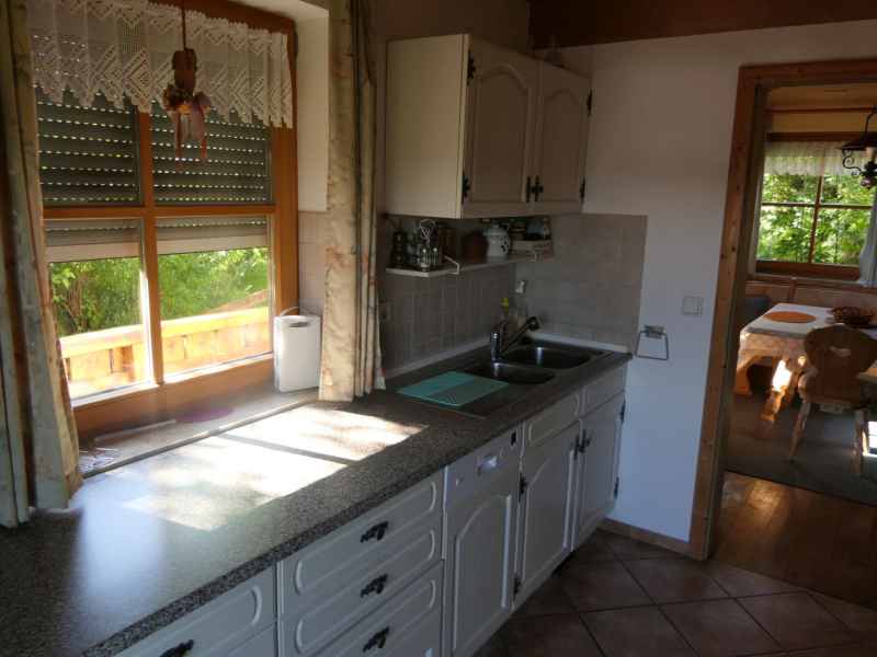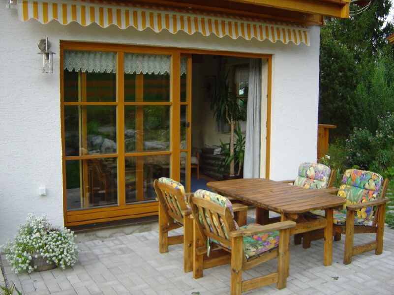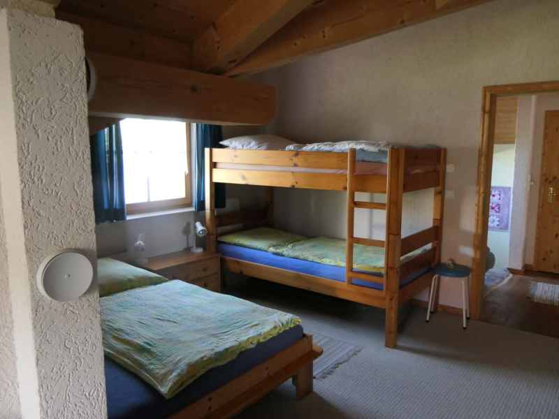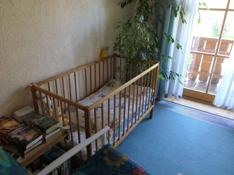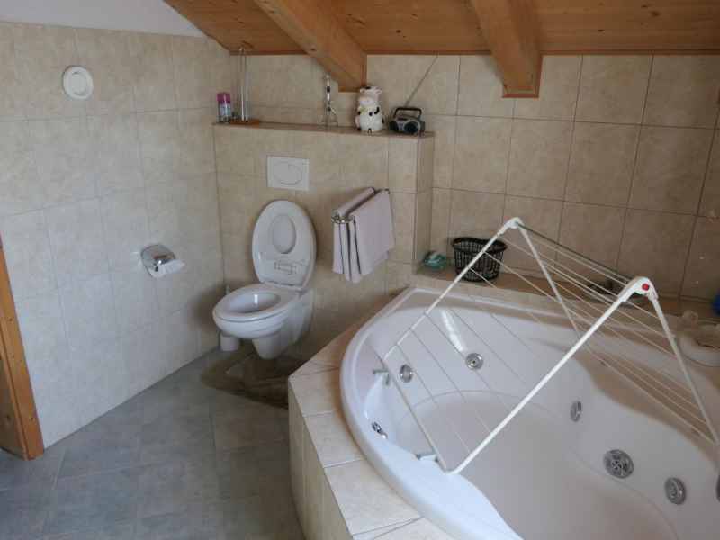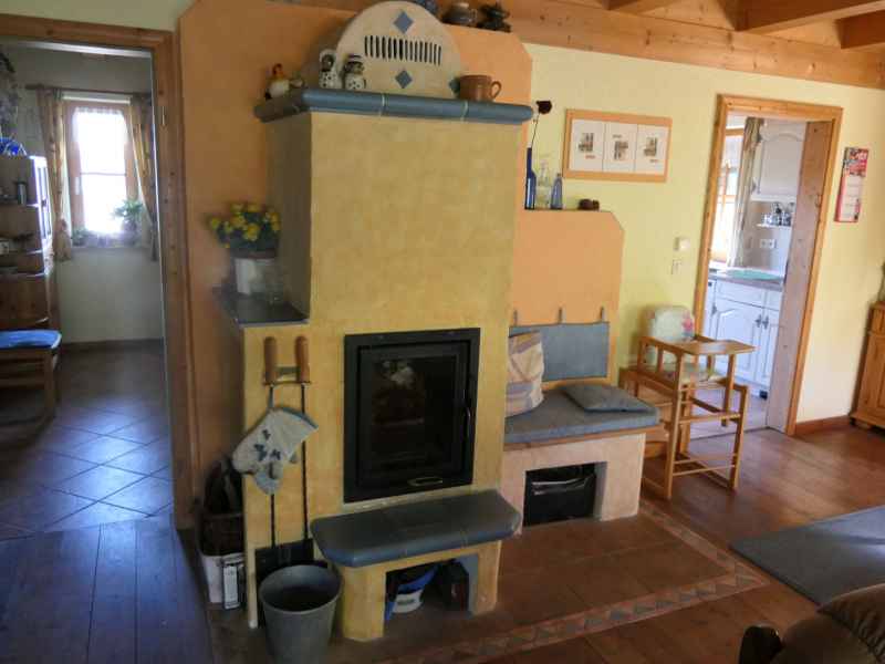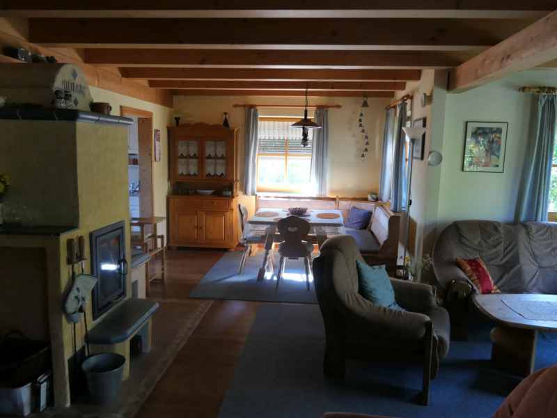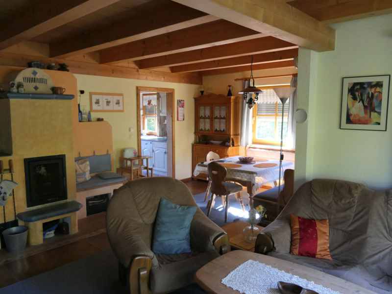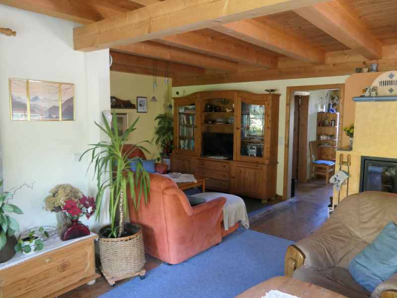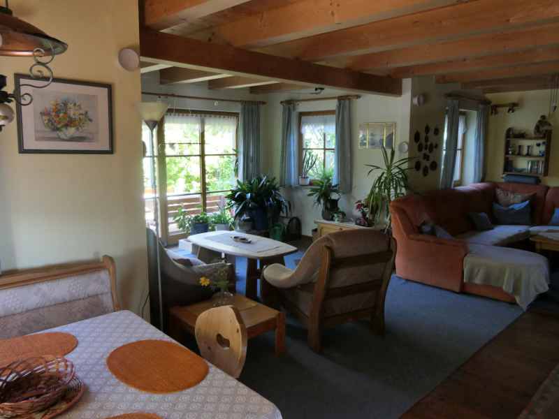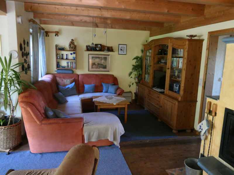 Die Wohnung hat 2 Ebenen, die durch eine Innentreppe verbunden sind. Im Erdgeschoss befindet sich der Wohnbereich (Gesamtwohnfläche EG ca. 65m²): Toilette, Wohnzimmer (ca. 40m²) mit Eckbanksitzgruppe, Polstermöbel-Sitzgruppe und Kachelofen. Küchenzeile mit Elektroherd und Geschirrspüler. Die Südterrasse ist vom Wohnzimmer aus zu erreichen. Umlaufender großer Balkon auf Südost- und Nordostseite (Hanglage).